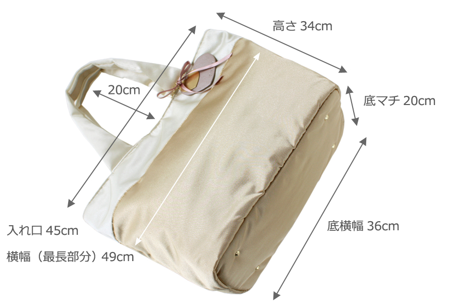 | サイズ | 約 底横幅 36cm(最長部分の横幅 49cm)× 高さ 34cm × 底マチ 20cm |